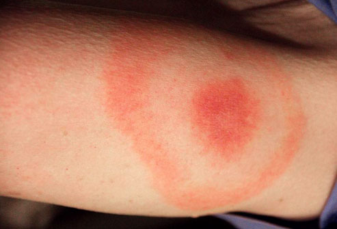 Đặc trưng của bệnh Lyme là ban đỏ hình bia xuất hiện 1 - 2 tuần sau khi bị ve đốt, mặc dù không phải ai cũng sẽ xuất hiện ban đỏ đặc biệt này. Ban đỏ có thể đi kèm với sốt, rét run và đau nhức cơ thể. Thủ phạm là một loại vi khuẩn trú ở loài ve nhỏ ký sinh trên hươu nao. Nếu không được điều trị, bệnh Lyme có thể ảnh hưởng đến khớp, hệ thần kinh và tim.