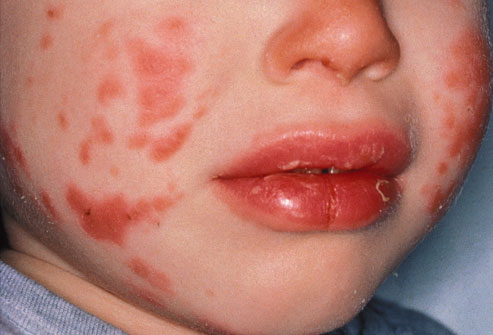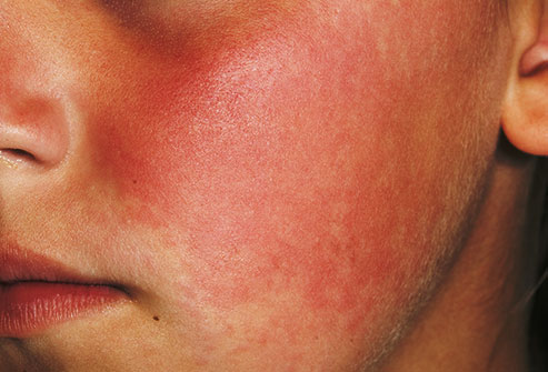 Thường gọi là bệnh “má đỏ”, hồng ban nhiễm trùng cấp gây ban đỏ tươi trên mặt trẻ. Ban đỏ cũng có thể xuất hiện ở thân mình, cánh tay hoặc cẳng chân.