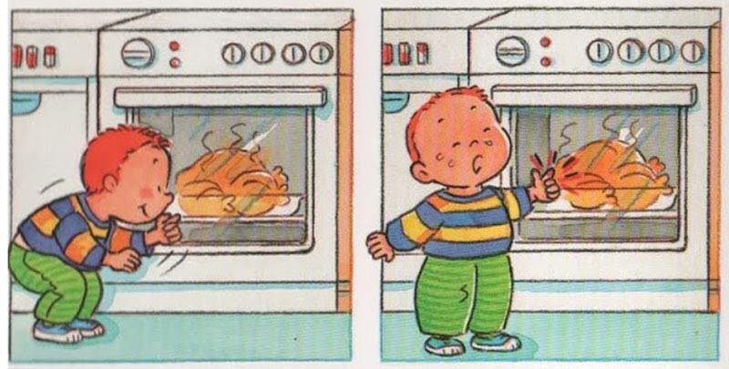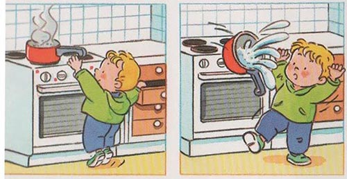 - Khi nấu nướng không để cán chảo, nồi chìa ra ngoài bé có thể với làm đổ thức ăn lên người.